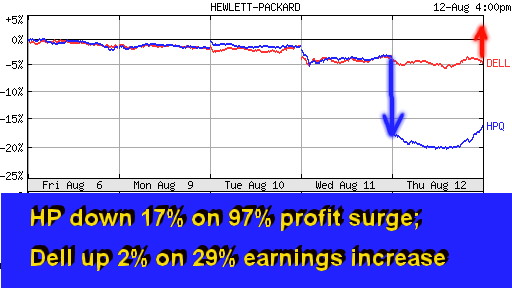 A SPECIAL ANNEX NEWSFLASH Analysis of HP's Preliminary Third Quarter Results Savaged by Wall Street Snatching Defeat from Jaws of Victory: Third-worst Stock Price Drop Follows Near Doubling of Net Profit!? PHOENIX, Aug 12 - The way Wall Street savaged the Hewlett Packard (HP) stock today, you'd think the company was in big trouble. About $10 billion of the company's market cap evaporated in less than a day, following HP's announcement of its third quarter results. The 17.6% decline (at the lowest point of the day) was the third-worst drop in HP's history (the worst being on Sep 4, 2001, when the company announced its plan to buy Compaq). And what actually happened? HP's net profit nearly doubled in the quarter. Its revenues grew by 9% since a year ago, with all but one of its business units contributing to the growth. In fact, four of the six HP business units grew in double digits. And the fifth one, the Imaging and Printing Group, whose revenue which rose by 8%, set a new record for the third quarter operating profit of $837 million, with a 15% operating margin. The only unit that under-performed the market and the HP expectations was the Enterprise Storage and Servers operation, whose revenues were down 5% since a year ago. The unit also racked up $208 million in operating losses. But since this morning's HP announcement focused on the trouble in that unit and the management changes that the HP CEO Carly Fiorina swiftly implemented, the news exploded like a bombshell on Wall Street, scaring investors and traders into panicked reactions. And what were the changes?