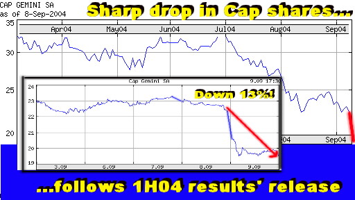 A SPECIAL ANNEX NEWSFLASH Updated 9/10/04, 9:15 A.M. PDT (adds "Not As Bad As It Seems") Analysis of Capgemini's First Half 2004 Results Stock Plummets on Unexpected Loss North American Operations Drag on Revenues, Profits PHOENIX, Sep 9 - Capgemini surprised investors and analysts with a €20 million loss in its just-reported first half 2004 financial release. The fact that its chief financial officer, William Bitan, resigned, didn't help matters much, either. The Capgemini stock plummeted about 13% to €19.53 in today's trading in response to both disclosures (see the chart).