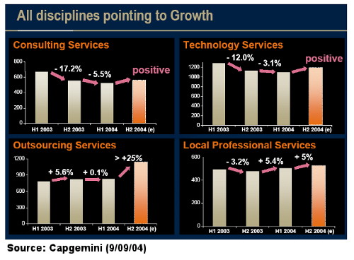 So it is in the SMB space that the key to future growth lies not just for Capgemini, but for the rest of its major competitors, too. Some of them are still busy trying to squeeze blood out of a stone - i.e., grow rapidly in a shrinking high-end marketplace. Others are cutting their noses off to spite themselves, such as EDS, whose CEO has just announced that he would cut another 15,000 to 20,000 jobs from its payroll (click here to read more about it). Besides, about €132 million of the charges that Capgemini incurred in the second quarter that led to its unexpected loss are related to "house cleaning" - getting rid of unprofitable contracts. You'd think the stock market would applaud that!? To the extent that that's it now, and that there won't be any more similar surprises in the future, such "house cleaning" actually also bodes well for the quality of Capgemini's revenues and earnings in the future. If in doubt, just check back with EDS for an example of how much worse things can get (e.g., with its Navy contract) if you do not clean house quickly and regularly. Finally, all four of Capgemini's business segments have now bottomed out and are poised for growth, according to a chart from its presentation to analysts (see above). And that's something that hasn't occurred in years (that the company is firing on all cylinders). For a real world example of what happens when that happens, check out Accenture: Revving Up a Notch (June 2004) and Accenture: Burning the Track (Mar 2004). In short, we would not be selling Capgemini short, both literally and figuratively. Maybe some others are realizing that, too. Capgemini's stock bounced back almost three points today (9/10/04) to close at €20.07. Happy bargain hunting! Bob Djurdjevic