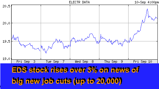 A SPECIAL ANNEX NEWSFLASH Stock Rises on News of Possible Additional, Bigger Layoffs Updated 9/29/04, 8:50 A.M. PDT (adds "The Manana Recovery") EDS to Cut Up to 20,000 More Jobs Former Insiders Stunned by CEO's Remarks PHOENIX, Sep 12 - By now, most people who follow EDS have heard the latest news initiated by its CEO, Michael Jordan. Seeking to reassure the company's jittery investors always hungry for cost cuts, Jordan said in New York on Thursday (Sep 9) that the company may jettison up to 20,000 additional jobs in an effort to take out another $3 billion out of its cost structure. What followed was a flurry of media reports, most expressing astonishment at how out of touch with reality the EDS CEO appeared to be - fixing something that's not broken (expenses), while not mending the broken fences (sales). Undaunted, investors bid up the stock following day. On Friday (Sep 10), EDS shares rose over 3% to close at $20.10 (see the chart).