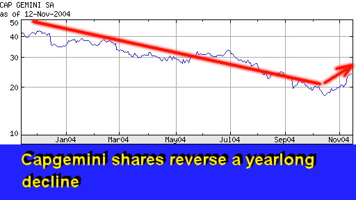 A SPECIAL ANNEX NEWSFLASH Analysis of Capgemini's Third Quarter 2004 Results Revenue, Stock Soars Revenues Up in Double Double Digits; U.K. , Central Europe Lead Recovery; U.S. Slowly Catching Up, Too PHOENIX, Nov 12 - Capgemini caught investors by surprise again on Nov 9 when it released its preliminary third quarter business results. This time, however, the market was surprised by a strong report card. The company's third quarter revenue soared by 21% (13% in constant currency) to €1.6 billion ($2.1 billion), led by its U.K. (+47%) and Central European (+22%) units. "The third quarter clearly shows a return to growth," said Paul Hermelin, Capgemini's CEO, during a Paris conference with analysts. He added that the 13% growth exceeded the company's target of 9%. Capgemini's stock also soared. Its shares went up by more than 10% the day the results were released (Nov 9). And they continued climbing the next three days, ending up with about a 15% gain for the week. The week's rise reversed a yearlong decline (see the charts). Capgemini's turnaround should come as no surprise. Here's what we wrote on Sep 9, after its shares were trashed following its release of the first half 2004 results: