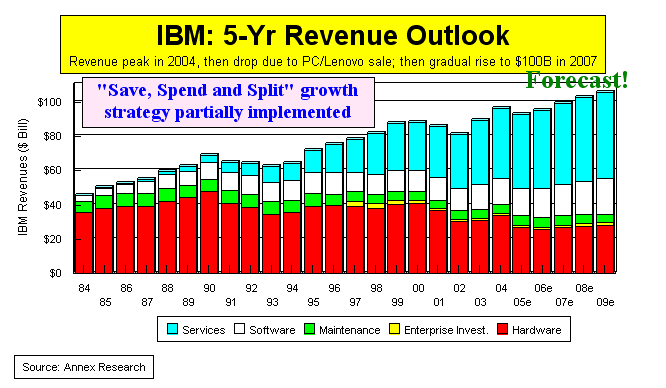 “Looks like Big Blue is partially implementing our recommended “Save, Spend & Split”- growth strategy.  We first annunciated it two years ago, and reiterated it last April (see “Save, Spend and Split,” May 2003, and “Ditto, Ditto! Is Anybody Listening?”, Apr 2004).
