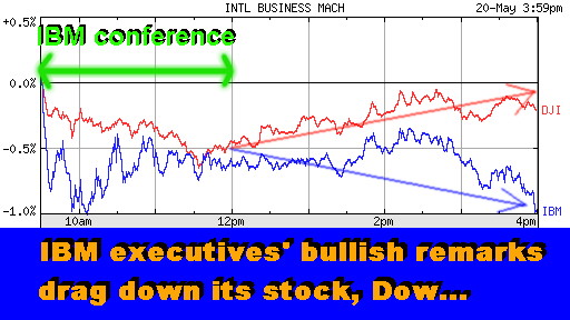 The messages fell on deaf ears.  Despite such bullish comments, the IBM stock dropped about 1% at the start of trading; cut its loss in half mid-way through executive presentations; and then dropped again at the end of trading, even as the Dow Jones industrials average, of which IBM is a part, rose later in the day (May 20 – see the chart).