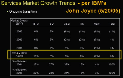 IBM expects overall outsourcing to continue to grow, albeit at a reduced rate (8% per year).  Integration services and consulting will grow at 6% and 5% per year respectively, while maintenance will decline at 2% per year (see the chart).