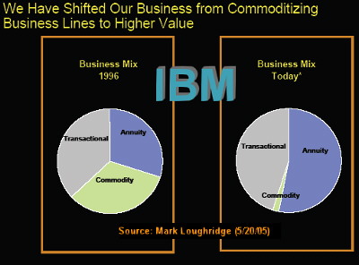 IBM has already shifted its model from commodity-like businesses to higher-value-higher-margin operations through divestitures and a change of strategic emphasis, especially in the last three years, said IBM’s Loughridge, the CFO (see the above chart and “Quality over Quantity,” Mar 2005).