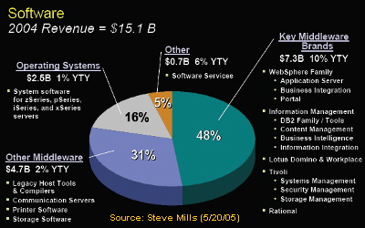 Mills’ unit also invests $2 billion annually in development, about a third of IBM’s corporate R&D budget.  And much of it goes into the so-called “middleware” products  (e.g., WebSphere, Tivoli, DB2, Lotus Notes...) that have helped fuel the zSeries (mainframe) revival.