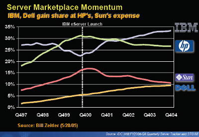 “For the full year (2004), the SMB (small and medium size business) grew at a lower rate than IBM as a whole (8% vs. 9%), giving rise to questions if Big Blue’s SMB campaign may be running out of steam,” we wrote in January.  In other words, 2004 was a year of a tepid increase for what is supposed to be IBM’s fastest growing market.