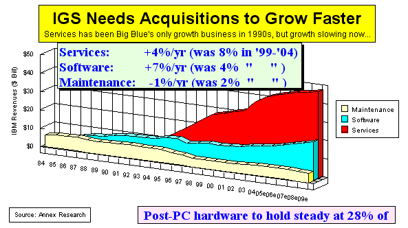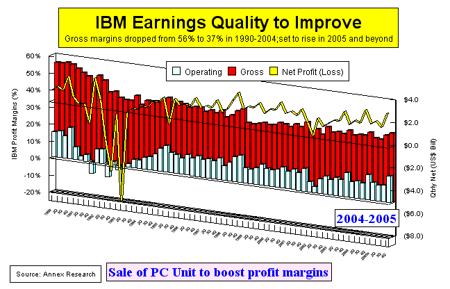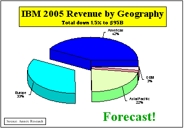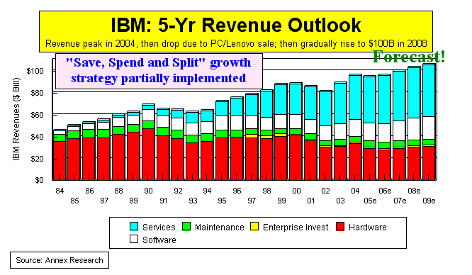 putting quality over quantity. By the way, any of these growth rates could change significantly up or down with any major acquisition or asset sale, in accordance with our “Save, Spend and Split”-strategy recommendation. PHOENIX, Mar 10 - Up until now, we have been assuming in our IBM revenue and profit forecasts that the IBM PC business sold to Lenovo would be a part of the Big Blue's results only in the first quarter of 2005. Well, now that it is evident that the second quarter business would also be conducted under the IBM label, we have updated our 2005 numbers.