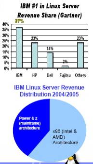 the Linux-driven server revenue gro Big Blue now commands a 37% share of Linux server revenues, equaling the combined total of the next two largest competitors – HP and Dell (see the chart). The third quarter Linux server revenues have jumped by 56% to $1.3 billion, growing four times faster that the Windows’ 13% increase, and nine times faster than the total server market (+6%), according to Gartner Group. It was the fourth quarter in row that Linux had mustered revenues of over a billion dollars.