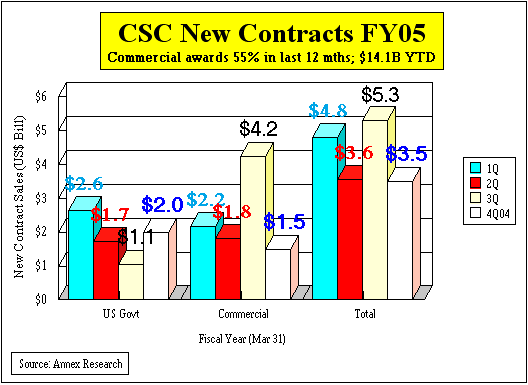 including commercial contracts. Outlook For the full fiscal year 2005, we expect CSC’s federal government business to decline in double digits, while its commercial revenues are likely to rise moderately (in single digits). Coupled with the four-to-one commercial new contract awards ratio in favor of commercial customers, it seems that we are once again on the doorstep of another reversal in CSC’s business.