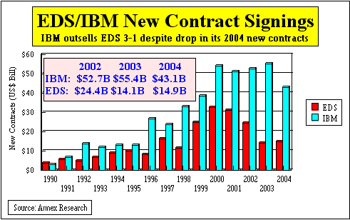 originally reported as $21.5 billion; then restated to $20.6 billion). New Contract Sales. Perhaps the most disappointing number, though not surprising, was EDS’ new contract sales drop. At $3.8 billion, it’s the company’s lowest fourth quarter sales record since 1998. And that was the last year of the Les Alberthal era, and the last nail in the coffin of his administration, that brought on a change and Dick Brown as CEO.