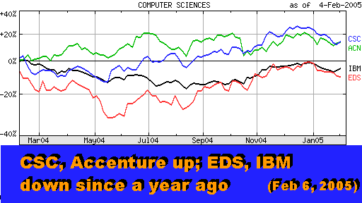 This morning's 6% drop in EDS' share prices in heavy trading suggests that even the company's most ardent institutional loyalists may be having second thoughts. Being "color blind" when it comes to technology has always been an important factor in customer selections of an outsourcing vendor. Up until now, we have thought that technological independence was a marketing advantage that "pure" IT services competitors, such as EDS, Accenture, CSC, Capgemini and others enjoyed over vertically integrated computer companies, like IBM, HP or Fujitsu. That's one reason we argued back in 1996 that IBM should spin off its IBM Global Services operation (see "Break Up IBM!", Mar. 1996). Well, EDS has now turned this argument on its head, and its natural advantage to its detriment. In a February 9 interview with Business Week, EDS' CEO Mike Jordan was quoted as saying that EDS is encouraging customers to switch from IBM or HP to its alliance partners, such as Sun Microsystems and EMC (see EDS Turbocharges Its Partnerships, Business Week, Feb 28, 2005). So from now on, when EDS competes with IBM or HP or Fujitsu, prospective customers can use this reverse bias against an EDS representative's claims of independence. Way to shoot yourself in the foot, EDS! (as if it's not full of holes already). PR Offensive to Defend Sagging Stock "What goes up must come down," we wrote in our year-end report on institutional investors (see "EDS: The Titanium Stock," Dec 2004). Eventually. "So it will the 'titanium stock' – EDS. Probably starting in the New Year, just as was the case last year" (see update Jan 7, 2005).