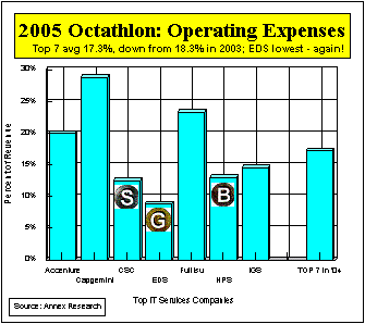 operating expenses were by far the lowest among the Top 7 competitors. The “silver” medal winner CSC came in at 12.5% of revenues, while the third place finisher HPS clocked in at 13%. IGS came fourth with a 14.5% ratio. It is essentially the same lineup of medal winners as last year.
