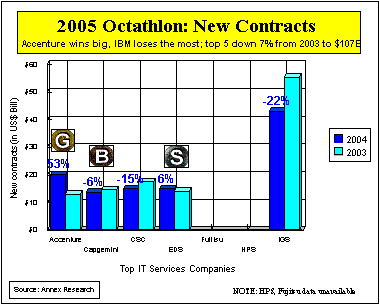 shows” in this Octathlon category. And now, here’s a “play-by-play” report from this year’s competition. 1.-2. Revenue Growth (2 Medals) The “gold” medal for the best revenue growth in 2004 went to Capgemini (up 15% over 2003). Accenture won the “silver” with a 14% jump, while HPS earned the “bronze” with a 10% spurt. IGS was fourth with an 8% increase in revenues, while EDS and CSC saw their revenues decline 4% and 5% respectively. The CSC revenue decrease is a result of its sale of the two former DynCorp units (see “Gearing Down on Purpose,” Feb 2005). As with previous Octathlons, all revenue figures used in this year’s competition were either the reported numbers for companies whose fiscal year-end ends Dec 31, or were our estimates of other competitors’ calendar year 2004 results. The “gold” for long-term growth (last five years) went to HPS (up 23% per year during 1999-2004). Capgemini won the “silver” with a 15% jump, while CSC snagged the “bronze” with an 8% compound annual increase during 1999-2004.
