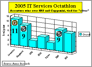earned three “gold’s” during the same period, while HPS claimed Just to recap quickly for our new readers the IT Services Octathlon scoring… The overall medal standings are determined by awarding three points for a “gold,” two points for a “silver,” and one point for a “bronze” in each of the eight competitions of the Top 7 global IT services vendors. The eight categories are: 1. Revenue Growth