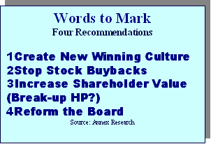In terms of overall market cap, the broken-up HP would be the No. 4 company among the IT leaders, behind Microsoft, IBM and Dell. Both Wall Street market rankings are about what you would think a No. 2 company in the business deserves, instead of being at the bottom of the stack. But as we said earlier, breaking up the company is not as compelling an option at HP as it was with IBM in 1996. The relatively modest (44%) stock price gain may be attainable by other means, too, while keeping the company together. What’s important, however, is that the new CEO is willing to consider all options, including the break-up. If for no other reason, that would be good for reinforcing the message that he is open-minded and welcoming of new ideas. Reform