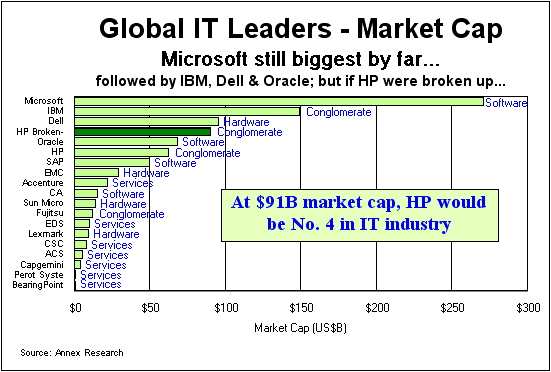 Upside-Down View”, Mar 2005) So how do you go about increasing shareholder value? By forcing Wall Street to value your strengths, and by reducing or eliminating your weaknesses. And how do you do that? By breaking up the company and spinning off various units is one way. If this sounds familiar to our old clients and friends, it ought to be. It is the same recommendation that we made to IBM when its stock was badly undervalued, just as HP’s is today (see "Break Up IBM!", Mar 1996). The main difference is that the break-up scenario in HP’s case in a little less compelling than was IBM’s nine years ago. Back then, we said IBM’s market cap would double (it actually increased more than three-fold in the next three years – thanks to stock buybacks).