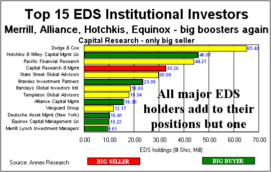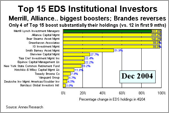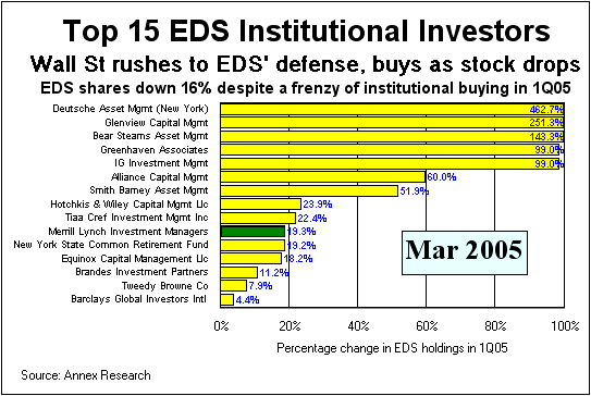 But Merrill was not alone in rushing to the defense of the EDS stock, and of its own interest in it. As EDS shares dropped in the first three months of the year, there was a buying frenzy among the institutional investors. Only one major holder - Capital Research - the fourth largest EDS shareholder, reduced its holding by an appreciable percentage in the first quarter (Capital Research sold off 3.7 million shares or about 10% of its EDS portfolio). Some have added massive amounts of stock (see the above chart). Yet before the Merrill upgrade, the EDS shares were still down about 16% since the start of the year. So you can imagine the blood bath that would have occurred with EDS shares had the market been allowed to work freely, without such massive interventions by large holders with self-serving interests. As you can see from the client-only ownership tables, the EDS sellers outnumbered the buyers 197-172 in the first quarter. But there were enough big institutional buyers to swing the pendulum upward - by 9.38 million shares. Merrill Toots EDS', Own Horn, Disregards Facts Meanwhile, if you still have some reasonable doubts about the Merrill bias, few should remain after you read what the company said about the latest EDS business results. Merrill analysts tooted EDS' horn, and therefore, their own firm's interests, with complete disregard for objectivity and facts. "While EDS is still in the midst of a multiyear turnaround, we now see less downside risk in the shares," Merrill researchers said, according to a Forbes May 26 report. The research firm cited EDS' continued progress with restructuring as well as better visibility into free cash flow. "In contrast (to its competitors), EDS reported an inline first quarter with no specific contract issues," the Forbes quoted Merrill about its upgrade. "An inline first quarter?" Check out our contemporaneous report on the EDS first quarter ("EDS Misfiring on All Cylinders," May 2005). Looks like Merrill Lynch is also misfiring on all cylinders. Here's an excerpt:
