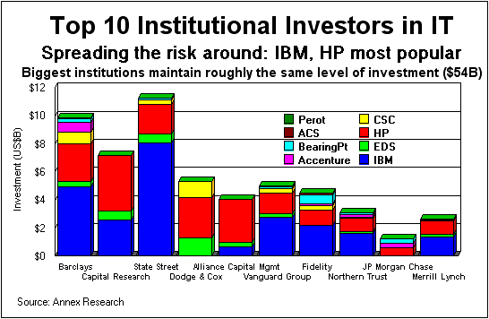 Summary The top 10 institutional shareholders of the top 8 U.S. IT services firms mostly held their ground in the first quarter at about a $54 billion investment level. IBM and HP continue to be the most popular choices, though there is some evidence that some investors have shifted their money from IBM to HP.