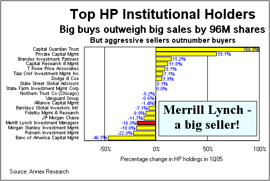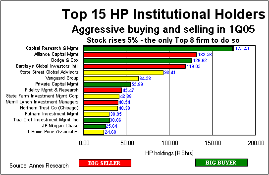 The sellers of the IBM stock outnumbered the buyers by 700-521. More importantly, they were big sellers. Overall, the institutions reduced their IBM holdings by over 22 million in the first quarter (see the client-only ownership tables for more details). And then came the Black Thursday (April 14 - see "IBM: Slammed and Dunked"). Despite the recent recovery in the value of its shares, IBM's market cap is down 24% since the start of the year. It's the steepest drop of any among the Top 8 U.S. IT services companies whose institutional ownership we analyze. We see no reason for it in IBM fundamentals (see "Tweaking Big Blue," May 2005). Selling IBM and buying EDS? It's an investment strategy likely to backfire in the long run. It's an upside-down view of the IT world. But then, Wall Street's is sometimes an upside-down view... (see "An Upside-Down View," Mar 2005). HP New Institutional Favorite, But Not Merrill's PHOENIX, May 27 - There is no better time to look for value than in the middle of a storm. That seems to be the message institutional buyers and sellers of Hewlett Packard's shares are sending from the first quarter. Both believers and doubters took active and strong positions amid executive turmoil (see "Carly's Fickle Fans," Feb 2005). They placed big bets both ways. In the end, the believers prevailed - by about 96 million shares - even though the institutional sellers outnumbered the buyers by 541 to 371 (see the client-only ownership tables for more details). As a result, HP is the only stock among the Top 8 U.S. IT services firms whose value has risen since the start of the year (up 5%). And so has the institutional ownership share (from 67% to 70%), as the public preferred to stay out of the storm.