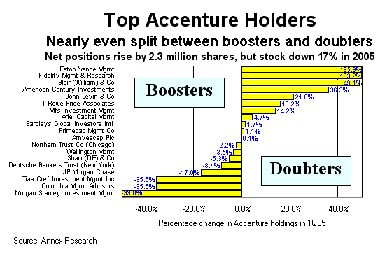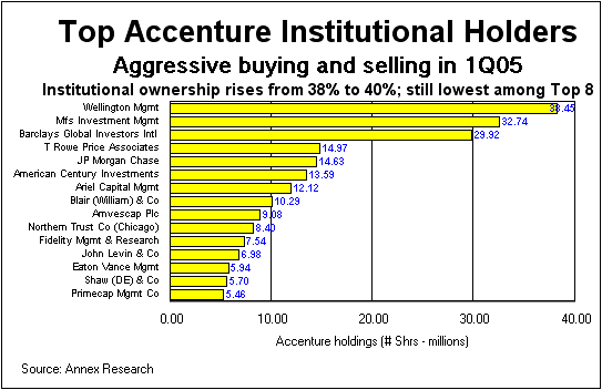 Morgan Stanley, for example, the fifth largest Accenture shareholder in early 2004 and the company that helped Accenture go public and lead secondary financing offer, has sold off most of its holdings. On April 8, the day after Accenture's latest earnings release (see "Accenture: Roaring Ahead," Apr 2005), Morgan Stanley also downgraded the stock. Deutsche Bankers Trust, another company that downgraded Accenture in early April, also reduced its holdings by 8%, while JP Morgan sold off 17% of its portfolio. Mfs Investments, on the other hand, the second largest Accenture shareholder, increased its stake by 16% during the first quarter. So did American Century Investments, Blair (William) & Co., and Fidelity - each of which added over three million shares to their Accenture portfolios.