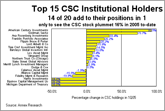Overall, the boosters outnumbered the doubters by 180 to 129, and outbid them by a total of 2.3 million shares (see the client-only ownership tables for more details). The CSC boosters also outnumbered the doubters, though by a narrower margin than in Accenture's case - by 234 to 216. And 13 of top 15 CSC shareholders added to their positions in the first quarter, giving the company a resounding vote of confidence. But that was not enough to keep the stock from falling by 16% to-date in 2005 (see the client-only ownership tables for more details).