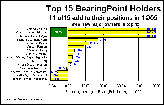 But there was no shortage of cheerleaders among BearingPoint's top institutional shareholders in the first quarter, when Harry You, formerly of Oracle, Accenture and Morgan Stanley, took over as CEO (see "BearingPoint's $3.4 Billion-Man", Mar 2005). Eleven of top 15 holders added to their positions, some massively. Brahman Capital, Columbia Management Advisors and Glenview Capital, for example, all three new to the top 15, placed four million shares or higher initial bets on BearingPoint's recovery under the new management. Overall, the institutional buyers outbid the sellers by 16.6 million shares, and outnumbered them 90 to 81.