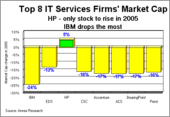 For additional Annex Research reports, check out... 2005 IT: Merrill's New Bull (EDS) (May 2005); IBM Trumps Trump (May 2005); Tweaking Big Blue (May 2005); Hurd's First RBI (May 2005); Dell Rings the Bell (May 2005); Stock Buybacks: The Phantom Is Back (May 2005); EDS Misfiring on All Cylinders (May 2005); HP Surges, Dell Slumps; Lenovo Completes IBM Deal (May 2005); Capgemini Jettisons Healthcare in N.A. (Apr 2005); HP: From India to Poland (Apr 2005); IBM: Slammed and Dunked (Apr 2005); Hurd Advice: Up Mount Market Cap (Apr 2005); Accenture: Roaring Ahead (Apr 2005); Fujitsu Unveils New Servers (Mar 2005); EDS Executive Suite; HP's New CEO (Mar 2005); An iSeries Revival (Mar 2005); EDS Booster Club Fees Rise (Mar 2005); An Upside-Down View (Mar 2005); The Worst of Both Worlds (Mar 2005); Octathlon 2005: Accenture Wins (Mar 2005); IBM Global Services: Smaller, Shorter - Better? (Mar 2005); IBM 5-yr Forecast: Quality over Quantity (Mar 2005); Rumor Lifts EDS', Fujitsu's Shares (Mar 2005); Capgemini: Turning the Corner (Feb 2005); IBM Servers to Grow Again (Feb 2005); Carly's Fickle Fans (Feb 2005); CSC: Gearing Down on Purpose (Feb 2005); EDS: Grossly Overpriced Stock (Feb 2005); IBM Historical Update: 2004 Shot in the Arm (Feb 2005); New HeadTurners Series #1 (Feb 2005); IBM: A Crescendo Finale! (Jan 2005); Accenture: Strong Finish, Better Start (Jan 2005); Annex Coverage 2004: IT Services Dominate (Jan 2005) 2004 IT: EDS: The Titanium Stock (and other Wall Street tales) (Dec 2004); IBM PC: Good Riddance (Dec 2004); Fujitsu: Recovery Continues (Nov 2004); IBM Server Renaissance (Nov 2004); HP Hits Home Run (Nov 2004); Capgemini: Revenue, Stock Soars (Nov 2004); EDS: Jordan's Swan Song? (Nov 2004); To Russia with Love and $ (Oct 2004); IBM: Slow Quarter No Longer (Oct 2004); Accenture: Revenues, Profits Up, Stock Down (Oct 2004); Capgemini: A Takeover Target? (Oct 2004); Sellout of America (Oct 2004); Spy Wars (Sep 2004); Outsourcing Boomerang (Sep 2004); EDS to Cut Up to 20,000 More Jobs (Sep 2004); Capgemini Stock Plummets on Unexpected Loss (Sep 2004); HP Savaged by Wall Street (Aug 2004); Moody's Lowers the Boon on EDS (July 2004); HP: Delivering Value Horizontally (June 2004); Accenture: Revving Up a Notch (June 2004); Beware Your CFO! (May 2004); IBM: Changing of the Guard (May 2004); Capgemini: Texas-size Home Run (May 2004); Following the Money (May 2004); EDS: On a Wink and a Prayer (Apr 2004); HPS Wins by a Nose! (Octathlon 2004); Accenture: Burning the Track (Mar 2004); IGS: "Crown Jewel" Restored? (Mar 2004); HP: Still No Cigar (Feb 2004); Cap Gemini: Another, Smaller Loss (Feb 2004); CSC: Good Quarter Gets Boos (Feb 2004); EDS: "Hot Air Jordan" Flaunts Flop as Feat (Feb 2004); IT Industry: Whither Goeth It? (Jan 2004); Cronyism Is Alive and Well at EDS" (Jan 2004)