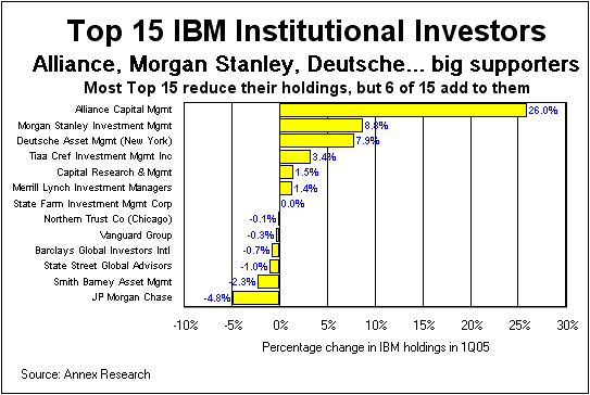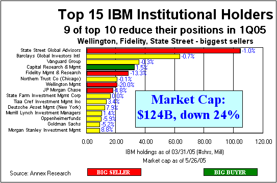 launched the advertising tagline, Bull or not, the Merrill recommendation put about $275 million into EDS's market cap, and proportionately added a share of it to its own $190 million+ EDS portfolio. But the stock is still down 13% for the year. So self-serving advice can be expensive, as we pointed out in "EDS Booster Club Fees Rise" (Mar 2005). Institutions Dumped IBM Well Before April Crisis PHOENIX, May 27 - IBM problems became widely discernible on April 14, the "Black Thursday," when the company made a surprise announcement of its first quarter results ("IBM: Slammed and Dunked," Apr 2005). But major institutional shareholder had been dumping Big Blue shares well before that. Our analysis of the Top 10 Big Blue holders as of March 31 shows that nine of them had reduced their IBM portfolios in the first quarter (see the charts).