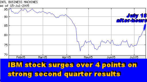 Analysis of IBM's Second Quarter Business Results IBM Bounces Back Quick Recovery in IBM Global Services, European Results PHOENIX, July 18 - It is not often that a large company can get practically instant gratification from its remedial actions (see "Tweaking Big Blue," May 2005). Yet that's exactly what happened when IBM released its second quarter results after the markets closed today (July 18). The company exceeded Wall Street's expectations in both profits and revenues, bouncing back quickly from a disappointing first quarter (see "IBM: Slammed and Dunked", Apr 2005). No wonder IBM stock surged by almost five points in after-hours trading. The Big Blue shares are still trading below the level from which they plunged in mid-April, following the disappointing first quarter results, dragging down much of the IT industry leaders' equities (see "IBM: Slammed and Dunked", Apr 2005). But IBM has gained much of the lost ground, and it appears poised for an additional upward spurt when the regular trading resumes tomorrow (see the above chart).