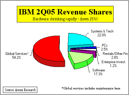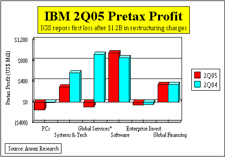 Business Segment Analysis The main reason for the "instant gratification" was that the two "problem children" of the first quarter have both bounced back. IBM Global Services' (IGS) new contract signings surged by 45% to $14.6 billion, while its backlog increased by $3 billion from the first quarter to $113 billion. And the European business has stabilized, with some parts of it (e.g., business consulting services) actually showing robust growth. Hardware. Furthermore, IBM hardware divisions continue to deliver great results. The pSeries, xSeries and iSeries servers, as well as storage, all reported double digit revenue growth. The iSeries' 10% growth was particularly impressive as it represents the first major reversal of its declining trends in 2004 (also see "An iSeries Revival," Mar 2005). The only exception were the zSeries servers (mainframes). They suffered a hiatus in demand as customers awaited next week's new product announcements before resuming their buying spree. And now that IBM is finally rid of its money-losing PC business (see "Lenovo Completes IBM Deal," May 2005, and "IBM 5-yr Forecast: Quality over Quantity," Mar 2005), the hardware profit margins have shot up five points (from 29% to 34%). But a pause in mainframe acquisitions has not slowed the customer demand for its software, or the implementation of new applications using on web-based mainframe tools and capabilities. The double digit growth percentages of all mainframe related software attest to that (since software is an annuity for which customers pay over time, it is not subject as much to the vagaries of product cycle changes as is mainframe hardware). And this bodes well for the mainframe hardware growth in the future. We expect it to resume in the fourth quarter, after the company starts shipping its new systems in September (also see "A zSeries Renaissance: Poughkeepsie Spring," Apr 2005). Software. The key IBM software brands grew by 17% in the quarter, lifting the overall software revenues to a double digit (10%) growth. The gross margin of 86.7% represented a half point improvement over the corresponding period a year ago. Given that IGS absorbed the brunt ($1.2 billion) of the $1.7 billion charge IBM took in the quarter, the biggest IBM unit ended up in the red for the first time in its history. The fact that PC lost money ($149 million) even while singing its Big Blue swan song was par for the course (see "IBM PC: Good Riddance", Dec 2004).
