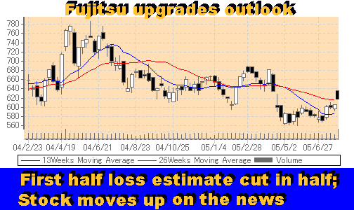 Analysis of Fujitsu's First Quarter Business Results Loss Reversed, Forecast Upgraded First Half Loss to Narrow Due to Overseas Business Growth; First Quarter Profit Reverses Loss from Year Ago NEW YORK, July 27 - Japan's largest computer company issued today an upgrade to its earnings forecast for the first half of its current 2005 fiscal year, saying it expected the loss to narrow from 30 billion Yen to 15 billion Yen. The stock market welcomed the news by pushing Fujitsu shares up 7 yen to 605 Yen. One day later (July 28 in Tokyo, July 27 in North America), Fujitsu released its first quarter FY05 results, buoying the market into an even great jump (up 25 yen). Both revenues and profits increased in the first quarter, the latter reversing the loss from the same period a year ago. The two back-to-back Fujitsu announcements helped reverse a declining stock market trend for the stock that peaked in mid-April, following the release of Fujitsu's year-end results (see "Revenues Flat, Lower Net," Apr 2005). Investors are beginning to realize the company seems to be back on track and may be poised for another growth year. "Posting operating and net