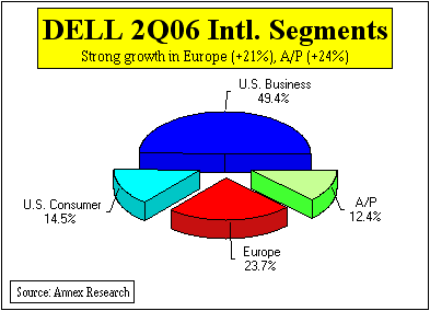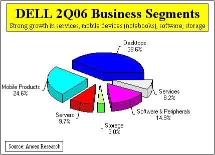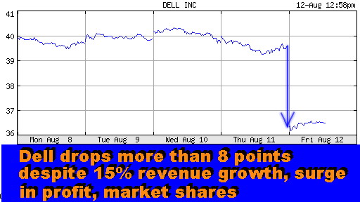 Analysis of Dell's Second Quarter Results Dell Spooks Street Wall Street Heads South Although Dell Results Point North PHOENIX, Aug 12 - Forget IBM, HP, Microsoft... Dell is the new IT bellwether stock. The Texas-based PC maker did it again. Dell rang the bell last night with its second quarter results just as it did back in May, signaling a tech stock rally that lasted almost three months (see "Dell Rings the Bell," May 2005). This time, however, the market headed south at the sound of the Dell bell, led by an 8% decline in Dell shares. Why? Because Dell's revenues increased by "only" 15%, as opposed to 17% - the growth Wall Street had expected. So instead of admitting that its research was faulty, Wall Street is finding fault with the company whose growth outpaced that of all of its major competitors. Never mind that Dell's EPS (earnings per share) jumped by 32%. Never mind that Dell's operating profit surged by 17%. Never mind that Dell's physical shipments soared by 25%. Never mind that Dell's overseas revenues rose by 24%. Never mind that Dell's services revenues skyrocketed by 41%; that its software and peripherals business increased by 35%; and that its storage revenues rose by 26%.
