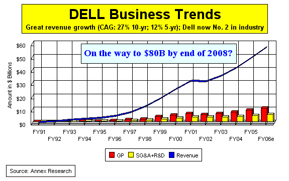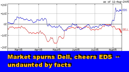 Well, Wall Street evidently doesn't get it, Ms. Rivituso. Not even after Dell tacked on another point in market share gains to its crown (it is now up to 19%). Dell vs. EDS: A Study in Contrasts As we noted back in March, Wall Street usually gets it if it looks at IT companies upside-down (see "An Upside-Down View," Mar 2005). Dell and EDS, the two blue Texas high-tech roses, a case in point. They are a study in contrasts, especially when it comes to Wall Street treatment.