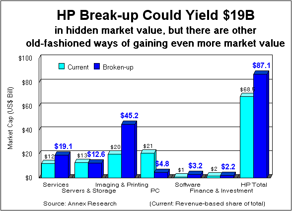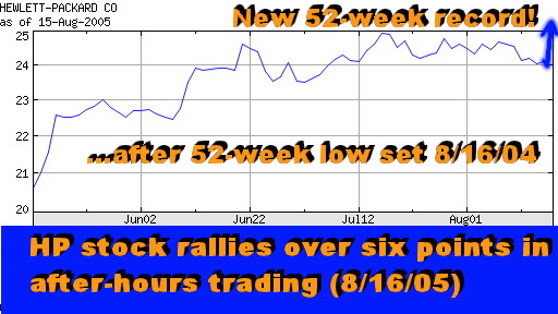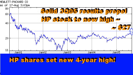 The increase in HP's market cap puts the company's P/E and other ratios roughly on a par with industry average for most of its units except one - Printing & Imaging. As a result, breaking up HP now could yield only about $19 billion of additional market cap (as opposed to $25 billion back in April - see "Hurd's First RBI," May 2005). Spinning off its IPG unit, on the other hand, might produce a $25 billion benefit to the HP shareholders. But that would be tantamount to selling one's crown jewels. And we're yet to see a king or a queen willing to do that. So stand by for about $22.6 billion revenue in HP's final fiscal 2005 quarter, and for an EPS of 44 to 37 cents per share, excluding write-offs and other one-time items. Which would out the company on track for full year revenues of over $86 billion, and net earnings of over $4.16 billion (again, without special one-time charges). Not bad for a first year of a turnaround. Annex clients click here for a detailed HP Consolidated FY2005 forecast and valuation Happy bargain hunting! Bob Djurdjevic PHOENIX, Aug 17 - Propelled by solid third quarter results, the HP shares continued their climb in today's trading. By late afternoon, they surpassed the four-year high, reaching $26.95 before easing slightly to $26.74. The last time HP shares traded in this price range was in July 2001 - i.e., prior to the 9/11 and the Compaq merger (see the chart).
