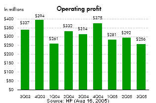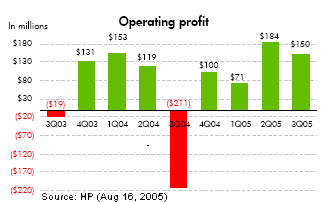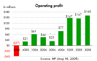 Analysis of HP's Third Quarter FY05 Business Results Sweet Turnaround Hurd Hurtles Easily Over Hurdles in First Full Quarter on His Watch PHOENIX, Aug 16 – Mark Hurd, HP's new CEO, hurtled easily over the hurdles in the first full quarter on his watch. After dropping 1.5% in regular trading today (Aug 16), Hewlett Packard (HP) shares rallied by over 6.5% in after-hours market this evening, surging to a new 52-week record on the strength of a solid third quarter report card. HP reported third quarter net income of $73 million, or 3 cents a share, compared to $586 million, or 19 cents a share in the year ago period. The results were reduced by $960 million in taxes on $14.5 billion of repatriated earnings. Excluding one-time items, HP earned $1.1 billion, or 36 cents a share. Both revenue and earnings figures were above Wall Street estimates. It was a sweet turnaround, especially compared to the disastrous third quarter of 2004 that sent HP shares tumbling to $16.51, a 52-week low set exactly one year ago today (Aug 16, 2004 - see "HP Savaged by Wall Street,"). Ultimately, that quarter signaled the beginning of the end for HP's former CEO, Carly Fiorina. Enterprise Systems.