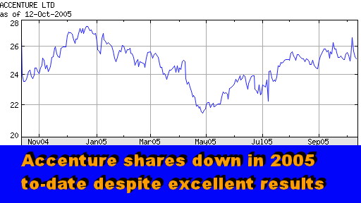 Accenture Stock Price Doesn't Match Its Excellent Results PHOENIX, Oct 13 - If business performance were the sole criterion driving the stock prices of public companies, Accenture should be setting new all-time records, just as its business performance did in early October, when the company released its final fiscal year 2005 results (see "Accenture: A Whopper Quarter," Oct 2005). Alas, Accenture's shares are down about 7% year-to-date despite its excellent business results.