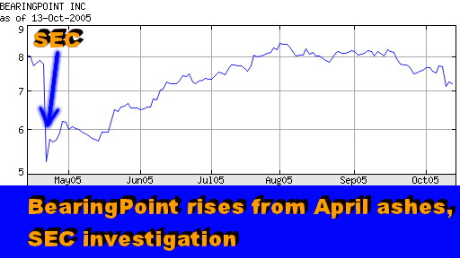 BearingPoint Rises from April Ashes PHOENIX, Oct 14 - When Harry You, the former Accenture and Oracle CFO, joined BearingPoint as CEO in late March, the company's stock rose $3.4 billion in response (see "BearingPoint's $3.4 Billion-Man", Mar 2005). But it has not been all roses for You since that time. On the contrary. A few weeks later, BearingPoint's disclosure of an SEC investigation of its improper accounting in prior years led to a stupendous fall in the company's market cap (see the chart).