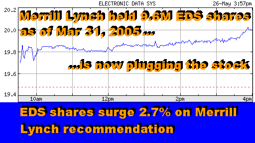 The key question, however, is when exactly did Merrill sell these EDS shares? If it happened on or after May 26, the SEC or Mark Spitzer could have a field day. Why May 26? Because that's when Merrill upgraded the EDS stock, giving it a temporary boost. If, however, Merrill had sold off most of its EDS shares well before that date, the company does deserve kudos for proving the independence of its research. Analysts zigged while the Merrill traders zagged.