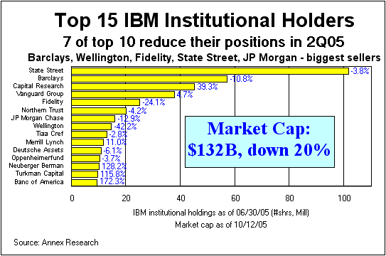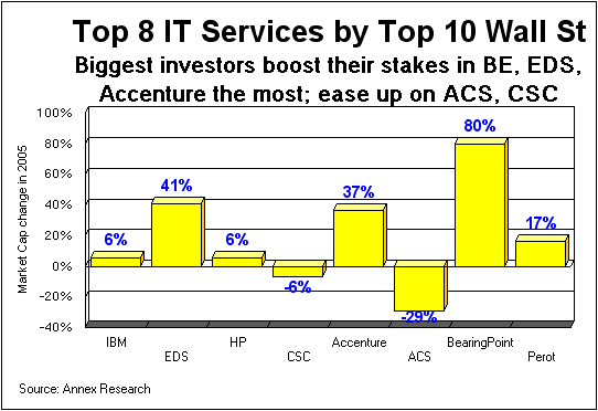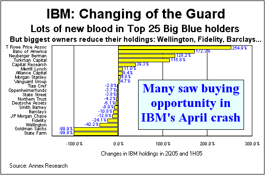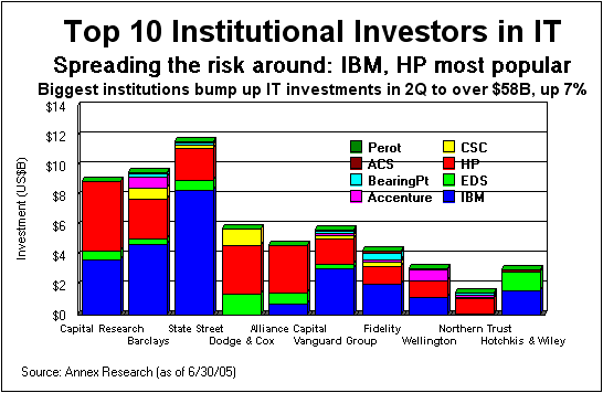 Analysis of Institutional Shareholdings of Top 8 U.S. IT Services Companies in Second Quarter Top Wall Street Firms Bump Up Investments Lots of New Blood Emerges from IBM's April Blood Bath; As Biggest Owners Dump Their Shares, Others Snap Them Up Merrill Deserts EDS, Most Big Holders Boost It HP Stock Lifted by Broad Public Support? Accenture Stock Price Doesn't Match Its Excellent Results BearingPoint Rises from April Ashes SUMMARY: Top Wall Street Firms Bump Up IT Investments PHOENIX, Oct 12 – "One man's trash is another man's treasure," goes an old saw (actually lifted from Matthew 13:31-33, 44-52). When IBM stock crashed back in April, following the release of its disappointing first quarter results (see "IBM: Slammed and Dunked," Apr 2005), many of its biggest shareholders panicked. Barclays, State Street, Fidelity, Wellington, JP Morgan Chase... each sold off several million IBM shares in the second quarter.