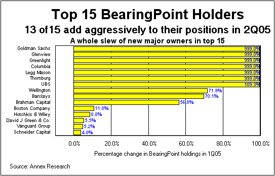 A whole slew of new major BearingPoint shareholders that jumped on the You bandwagon in the second quarter must have been wringing their hands in glee. Among the new BearingPoint/You aficionados were such Wall Street icons as Goldman Sachs, UBS and Wellington. But many smaller companies also placed big bets on BearingPoint's turnaround (by buying in millions of its shares). Glenview, Greenlight, Columbia, Legg Mason, Thornburg... were the biggest and the bravest among them. In fact, 13 of 15 top BearingPoint shareholders added aggressively to their positions as the stock slumped in the second quarter. The company's largest shareholder, however, Fidelity, and the third largest, Pzena Investments, were the only two detractors. They sold off 5.77 million and 6.97 million shares respectively in the second quarter.
