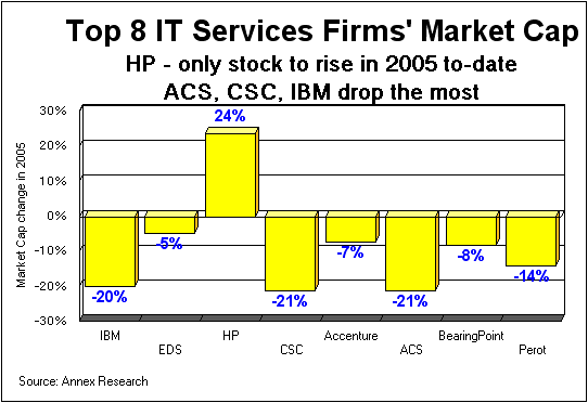 HP was the only IT stock among the Top 8 whose market cap is actually up this year-to-date (up 24%). ACS, CSC and IBM lead the declining column with 20% plus losses so far in 2005.