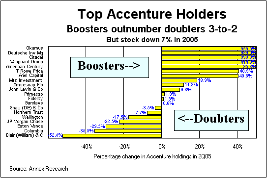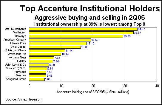 Accenture's largest institutional shareholder, Mfs Investment Management, which owned over 34 million shares as of June 30, was also a net buyer in the second quarter. The firm added 1.34 million shares to its Accenture portfolio. But the second largest holder, Wellington, was among the big sellers, having dumped 5.6 million shares in the second period. Wellington was joined by William Blair & Co, JP Morgan Chase and Eaton Vance... some of other big sellers.
