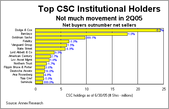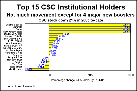 CSC: Not Much Movement Among Top 15 PHOENIX, Oct 16 - After having weathered a deflation of the CSC stock in the first quarter, the company's top 15 institutional shareholders pretty much sat on their hands in the second period. But some new CSC boosters placed big bets in its favor during the April-May IT stock doldrums. Goldman Sachs, Seminole, Pzena and New Jersey State led the way and joined the top 15 in the second quarter.