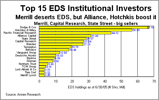 Merrill Deserts EDS, Most Big Holders Boost It PHOENIX, Oct 12 - It was a passionate affair, albeit short-lived. After being one of EDS' biggest boosters in the first quarter, Merrill Lynch unceremoniously dumped its erstwhile flame (see "Merrill's New Bull [EDS]" May 2005). The Wall Street behemoth sold off 6.2 million EDS shares in the second quarter. This turned the biggest EDS bull into the loudest bear among the top 25 institutional owners of the Dallas-based IT services firm.