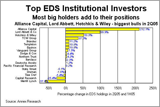 While we leave the Merrill-EDS break-up for the authorities to sort out, most of EDS' other institutional owners stayed loyal to the beleaguered company. Several of them added huge (multi-million share) amounts of stock in the second quarter their holdings. Alliance Capital, for example, bought 15.5 million shares. Hotchkis & Wiley put another 10.9 million shares into its already lofty EDS portfolio. Northern Trust, secured 7 million additional shares in the second period. And so on...