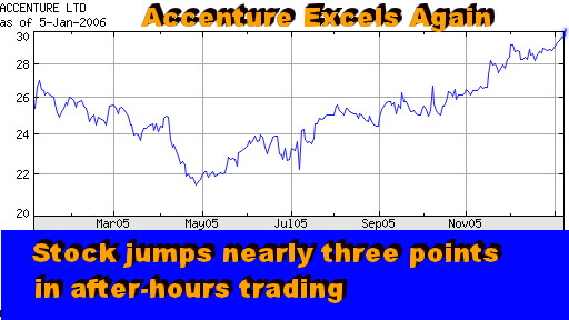 Analysis of Accenture's First Quarter Business Results Accenture Excels Again Stock Smashes Records in After-Hours Trading HONOLULU, Hawaii, Jan 5 - "It doesn't get much better than this," we said about Accenture's last report card (see "A Whopper Quarter," Oct 2006). And then it just did. Accenture outdid itself again after the markets closed today (Jan 5). Maybe the company should rename itself Excellenture? J