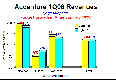 Geographies. The Americas region showed the fastest growth for a second quarter in a row. Its revenues were $1.86 billion, up 19% from $1.55 billion in the first quarter of fiscal 2005 (18% in local currency). Accenture's acquisition of Capgemini's North American healthcare unit aided the growth in this domain (see "Capgemini Jettisons Healthcare," Apr 2005). Europe, Accenture's biggest geography at $2 billion, grew in single digits (up 5% as reported; 7% in local currency). The Asia/Pacific area, on the other hand, also surged in double digits (up 14% as reported, and up 13% in local currency). As noted earlier, the company's overall revenue growth was 12%, both as reported and in constant currency.