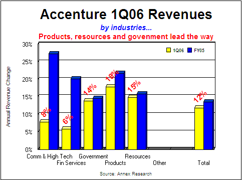 Industries. Among Accenture's vertical segments, "products" (meaning healthcare, automotive and retail) recorded the fastest growth in the first quarter, up 18% from the year before. It was the first time ever that Products' revenues exceeded $1 billion in a quarter. Government and resources industry groups also grew in double digits. But the increases in communications and high tech and the financial sectors slowed to single digits (up 8% and 6% respectively). These two vertical segments, that account for nearly half the company's revenues, had been the highfliers in the fiscal year 2005. Both grew in double digits in the fourth quarter and for the full fiscal year.