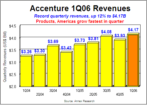 Once again, the IT services company was firing on all cylinders. All vertical markets and geographies grew in the first quarter of its fiscal year 2006, several of them in double digits. Once again, Accenture exceeded Wall Street's and its own revenue and earnings estimates ($0.36 per share on a 12% revenue jump to $4.17 billion, a new quarterly record). Once again, it generated tons of cash ($290 million free cash flow). But what set the latest quarter apart from the "as good as it gets" (we thought)- fourth quarter were two things: first, the best new contract bookings in seven quarters ($5.5 billion); second, the first ever dividend. No wonder the stock moved up nearly three points in after-hours trading, following the release of the first quarter results, to a new three-year and all-time high (the company went public in July 2001). Accenture closed at $29.68 in regular trading today, up 0.75%. It had set another 52-week high of $29.82 in intraday trading. "We grew revenues while keeping our costs in line," said Bill Green, Accenture's CEO. But the company did more than just "keeping costs in line." Expenses actually declined as percent of revenue, pushing the operating margin up nearly a point to 12.3% of revenue, as compared to 11.4% of revenue the year before. That was a 20% jump on a 12% rise in revenues.